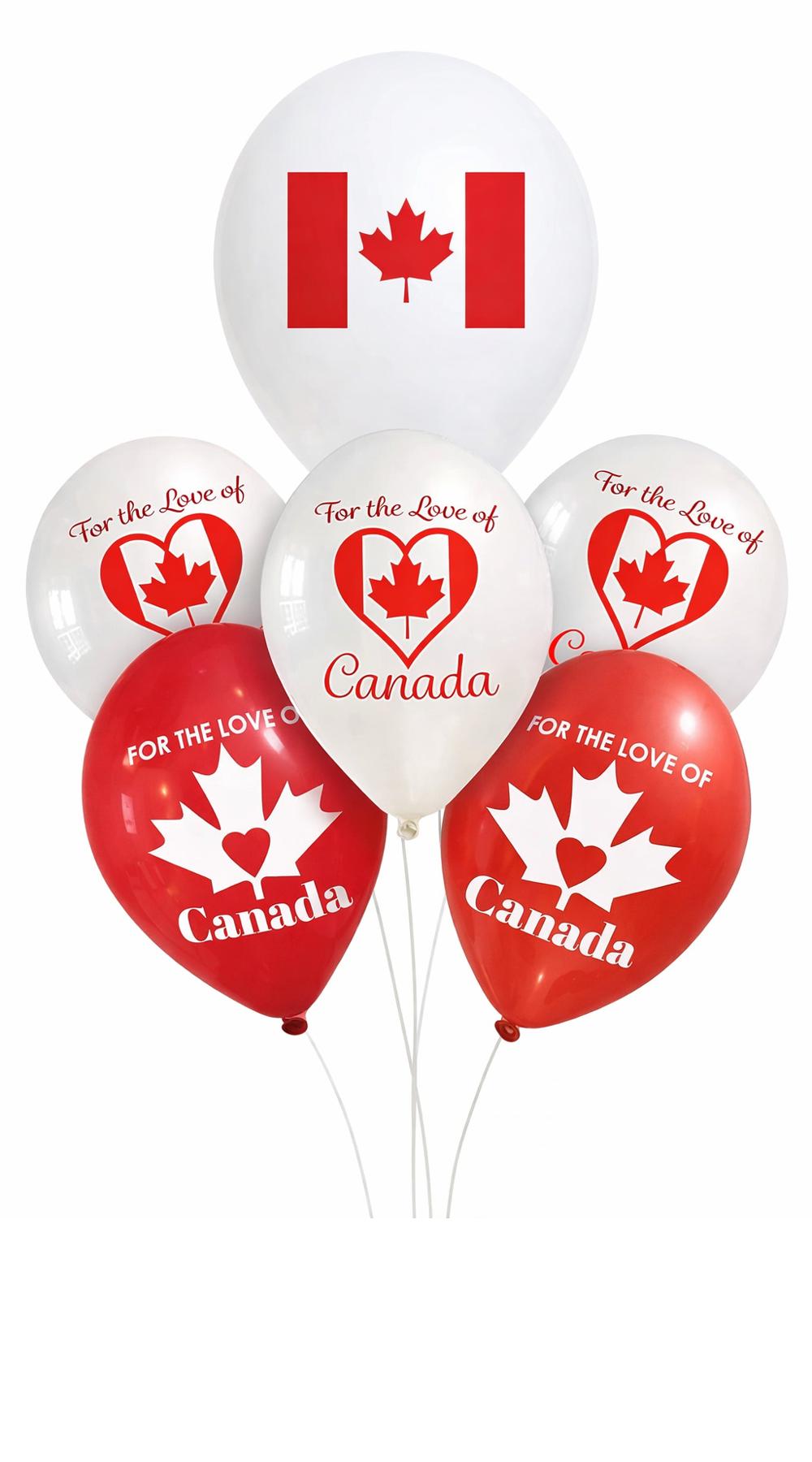 Mixed bright red and white Canada balloons featuring maple leaf designs and βFor the Love of Canadaβ branding. These balloons are perfect for decorating entrances, patios, event spaces, offices, and storefronts. They instantly create a festive Canada Day atmosphere and are one of the most popular items every year.