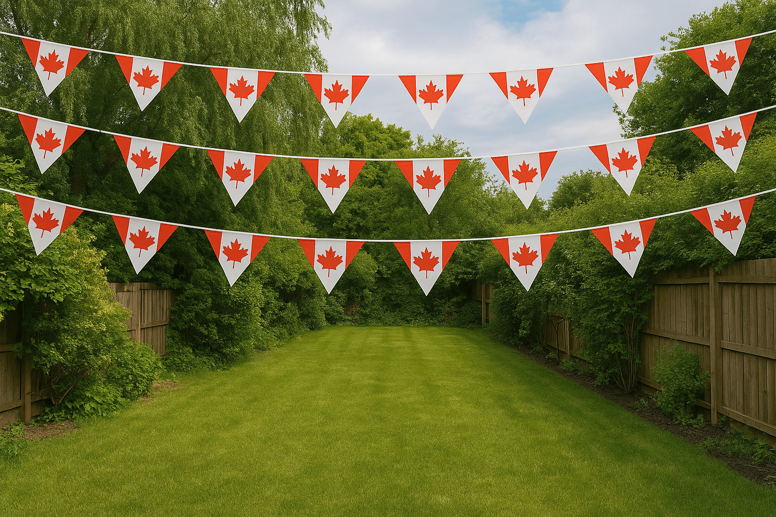 A 50-foot Canada flag banner with 25 flags, designed for indoor and outdoor use. Ideal for fences, decks, walls, stages, and large spaces. Durable and eye-catching, this banner helps create a strong Canada Day look across any setting.